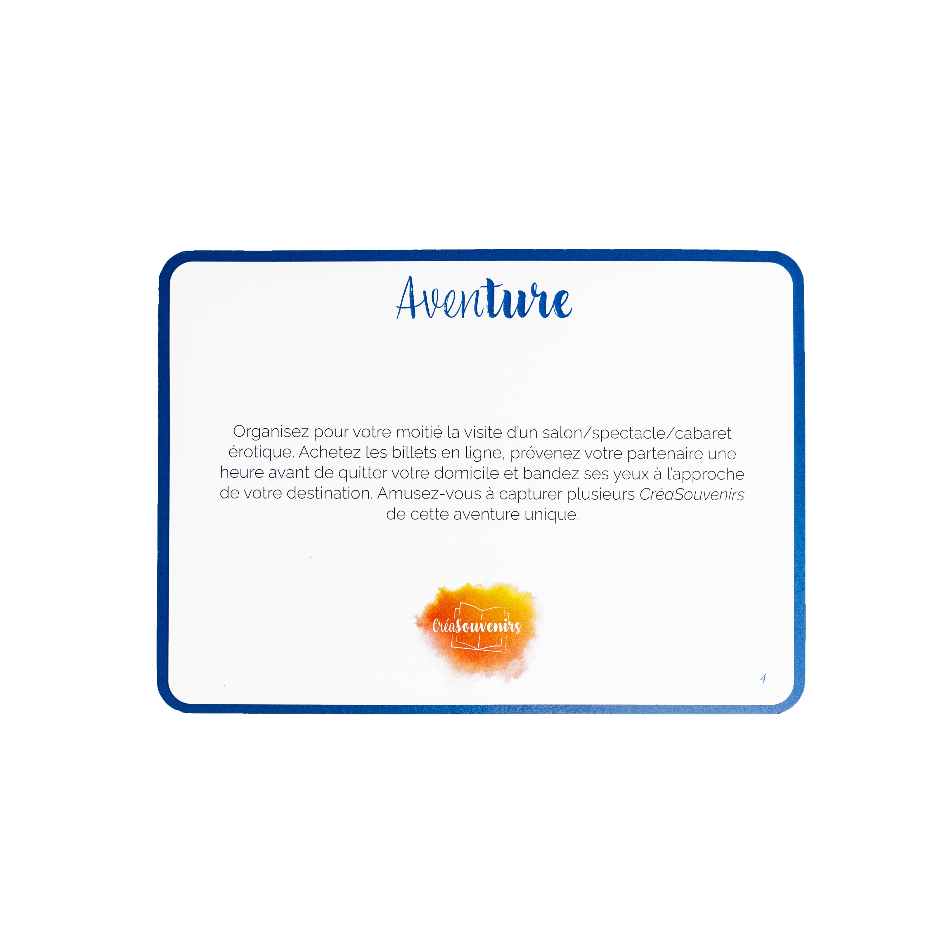 Avec plus de 90 idées inspirantes, réparties en 5 catégories (Aventure, Cocooning, Surprise sensuelle, Romance et P’tites vites), vous vivrez une panoplie d’émotions et de découvertes ; parfois drôles, parfois touchantes, mais toujours complices.